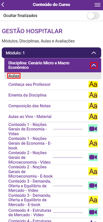 O conteúdo programático do curso é dividido em Módulo / Disciplina / Aula, ou seja, cada “Módulo” representa um semestre, dentro de cada “Módulo” teremos uma ou várias “Disciplina(s)”.