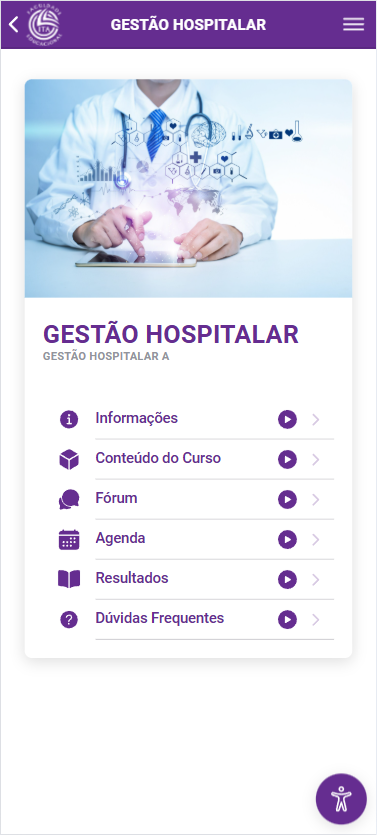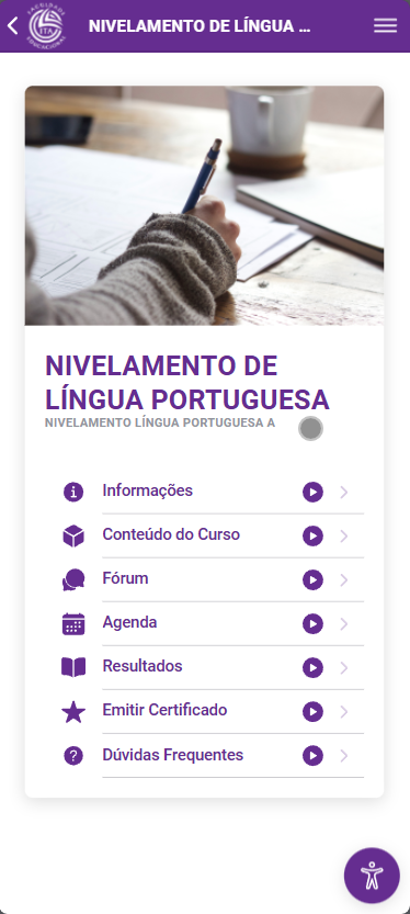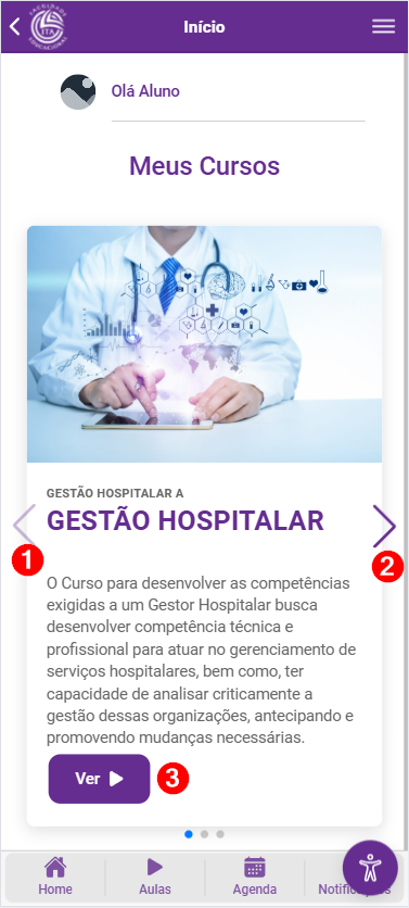 Na tela inicial do aplicativo é exibidos os cursos em que você está inscrito. Você pode navegar entre os cursos clicando nas setas < (1) e > (2) e caso queira acessar o conteúdo de um curso, pode clicar em "Ver" (3)