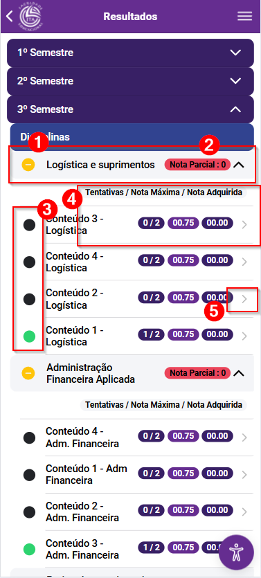 - No agrupamento das disciplinas é possível verificar sua nota atual
